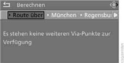 Sie können während der Zielführung bis zu zwei Punkte festlegen, über die die Route führen soll, z. B. Orte oder Autobahnkreuze. Diese Punkte werden vom Navigationssystem vorgegeben und hängen unter anderem von der Länge der Route ab.